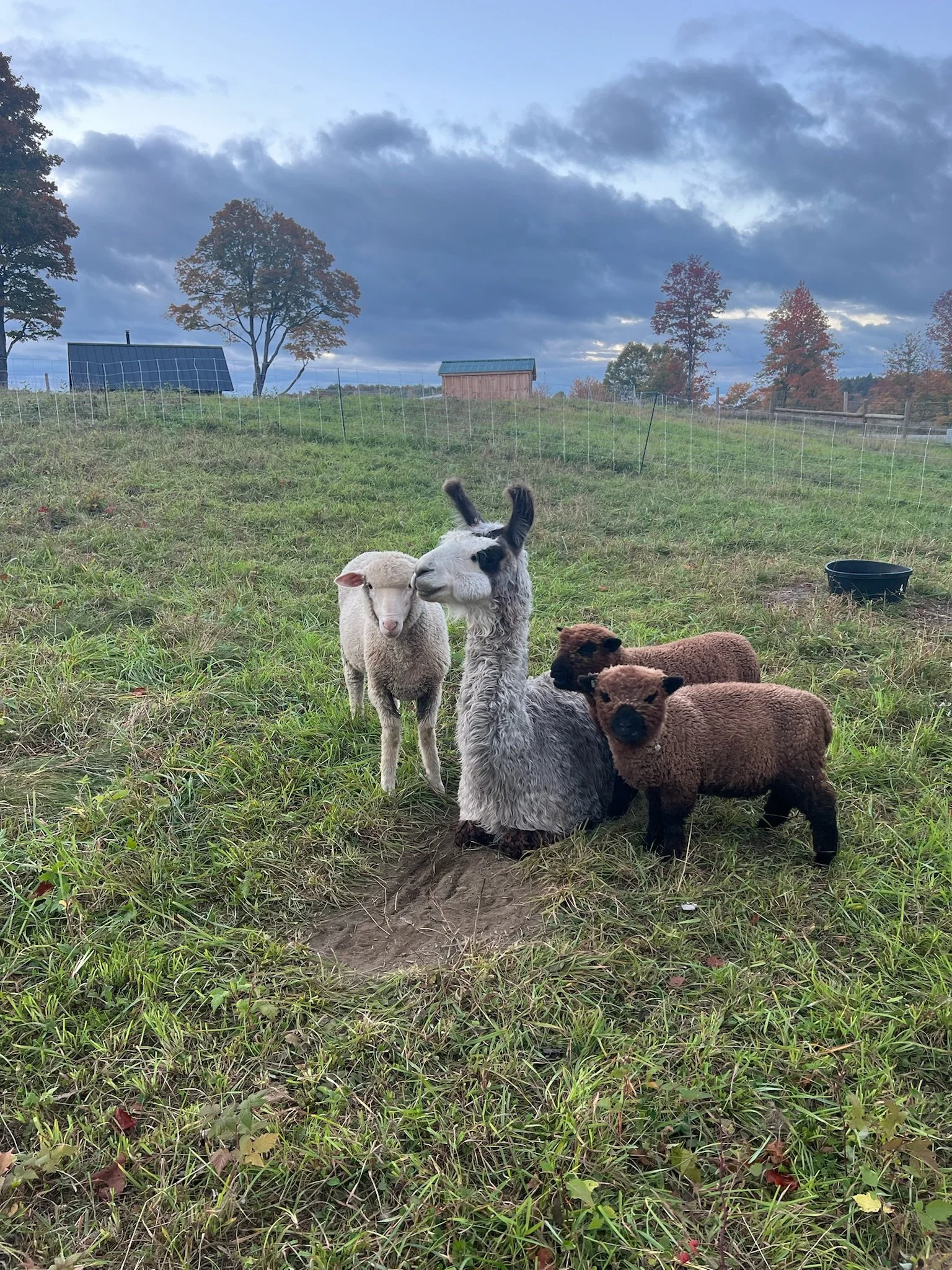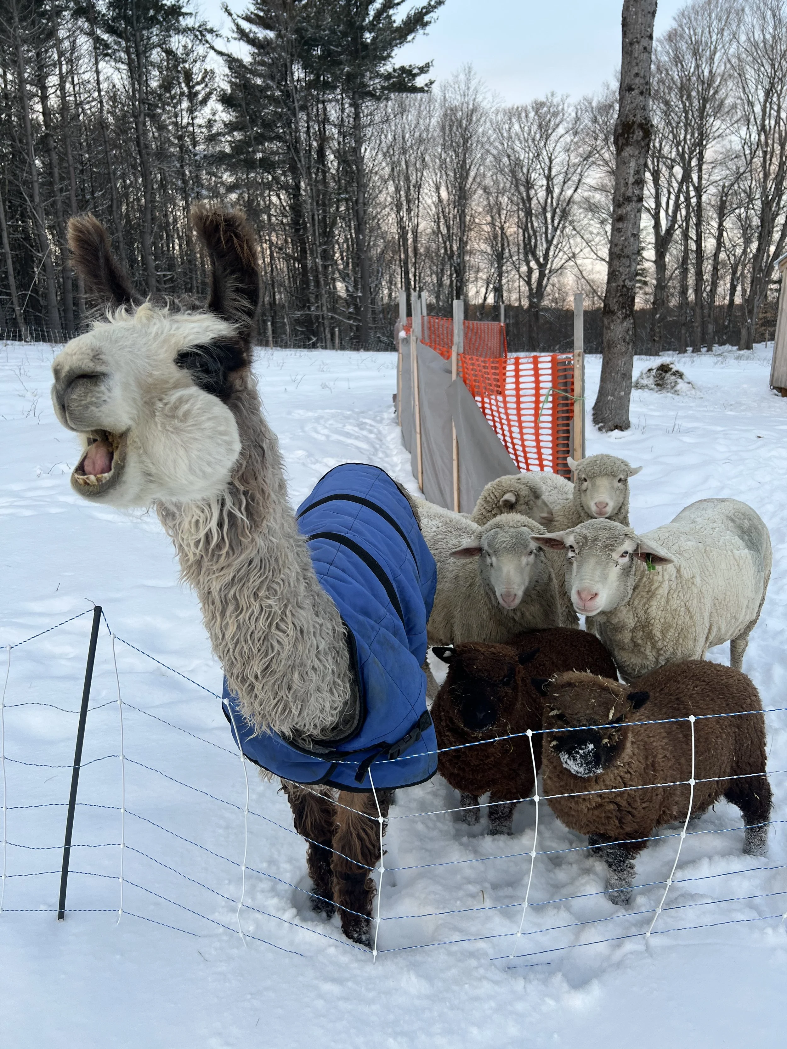 In June 2024, I brought Cloud to Sajima Farm from another sheep farm in Vermont. This 4-year-old gelded llama is at the center of the livestock on farm. He is the guard animal for my flock of sheep consisting of 5 Merinos and 2 Babydoll Southdowns (added in July 2024). Two more Babydoll Southdowns arrived in September, 2025. The sheep are rotationally grazed on my certified organic pasture. This means that I move them across the pasture setting up small, electrified paddocks every 2-3 days, not returning to any previous paddock for a minimum of 60 days matching the life cycle of parasite larvae. This is non-chemical way to help combat parasites, and to keep the sheep in supply of fresh forage.